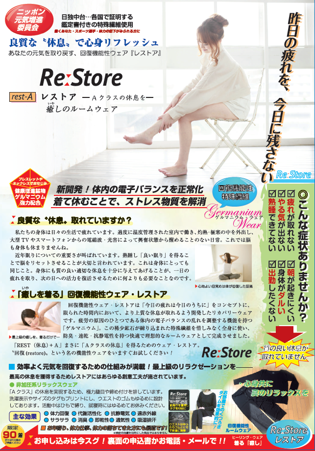 ストレス等により体内から失われた電子を補完するゲルマニウムを特殊技術で直接繊維に練り込んだレストアは、疲労回復機能を半永久的に発揮し続けます。あなたの体内の調子を復活させ、明日への活力を取り戻す、ヒーリング・リカバリーウェアを、今すぐお試しください!